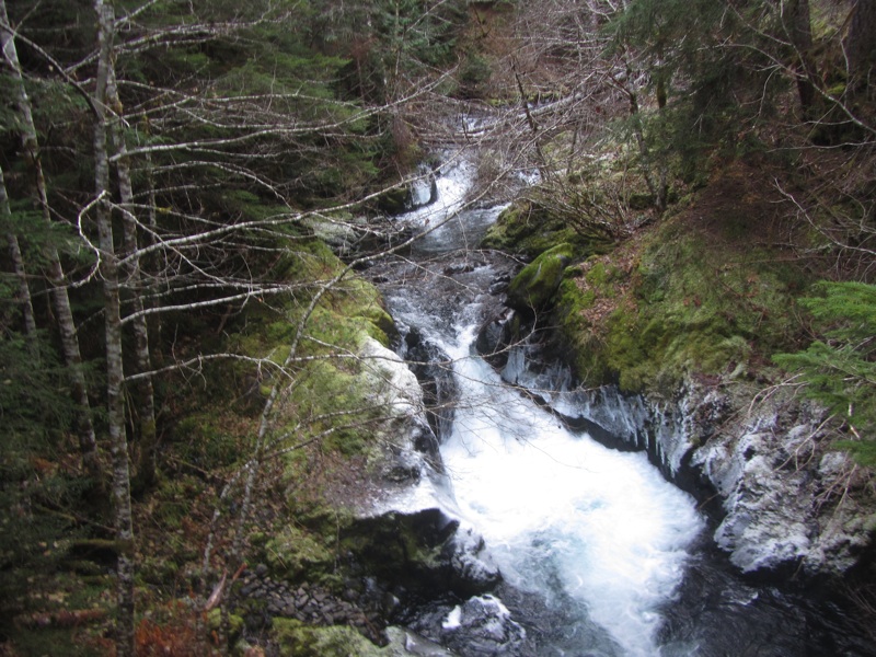 The trail to Olympic Hot Springs is open again after three long years. We had never taken the old trail, so this was a double first for us. Apparently, the road used to end quite close to the hot springs. Now, it's a 2.4 mile walk along a trail which was obviously the old roadbed. It was easy to tell. The trail is as wide as a road, and there were several bridges we crossed that were clearly designed for automobiles, not hikers. It was an easy 300 odd foot ascent from the trailhead to the hot springs, but here and there they cut drainage ditches right across the old roadbed. Some of them were a bit deep, and there was some ice on the trail, so we had to watch our step.