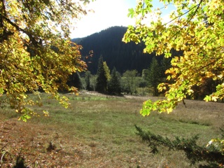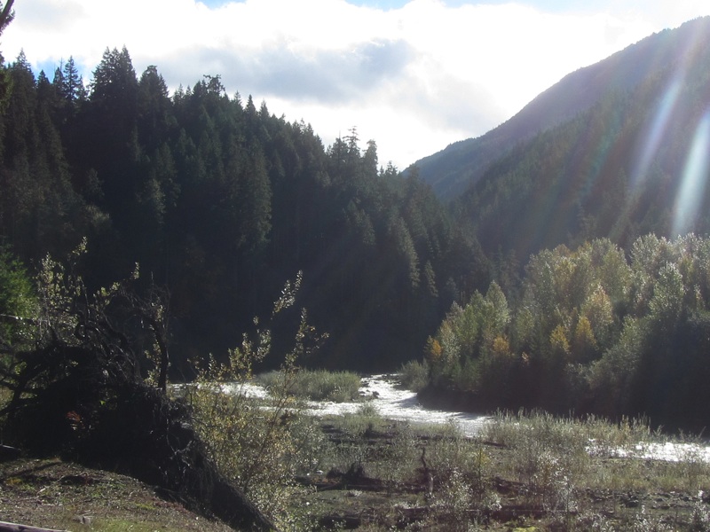 We took a short walk from Whiskey Bend down to the Elwha River. Despite the recent rains, the river is far from flooded, but the trail was pretty. The foliage color is nothing like the glory of a New England autumn, but we could see definite signs of fall. We also saw the new viewing station for the river where the old dam used to be.