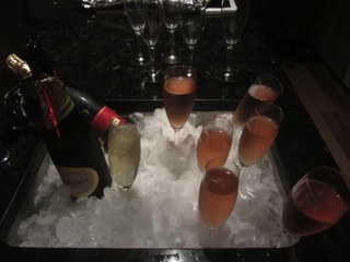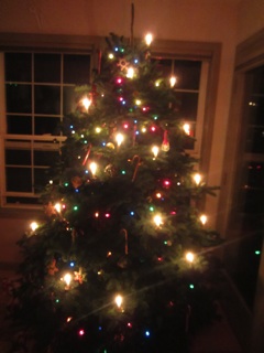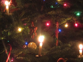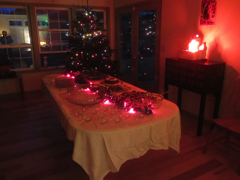We Kalebergs haven't quite reached peak Christmas yet. We're still mining the season, but we did have our annual grownups Christmas party. It's a choucroute year, but by the time the choucroute comes out of the oven, laden with smoked pork chops, sausages, duck breast, smoked pheasant, pork hocks, westphalian ham, potatoes, carrots, juniper berries and sauerkraut, everyone is hungry, so we didn't manage to take any pictures. Still, if you look closely, you can see our illuminated fruitcake, some half and half cookies, sweetmeats and candied grapefruit peel.