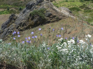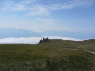We ran into some foggy spots on the road to Hurricane Hill, more or less centered around the tunnel, but by the time we made it to the Switchback trailhead, the sky was softly milky, but blue. It was dry on the trail to Hurricane Hill. It is only July, but we were seeing late summer flowers, the harebells and yarrow. There were butterflies everywhere.
