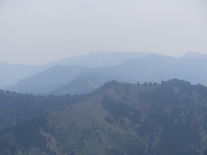 The clouds below filled the valleys and the haze softened the mountains. This wasn't the usual crystalline mountain air. Mount Olympus, in the distance, was softened, almost part of the cloudscape.