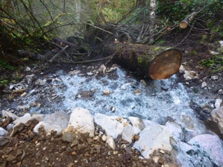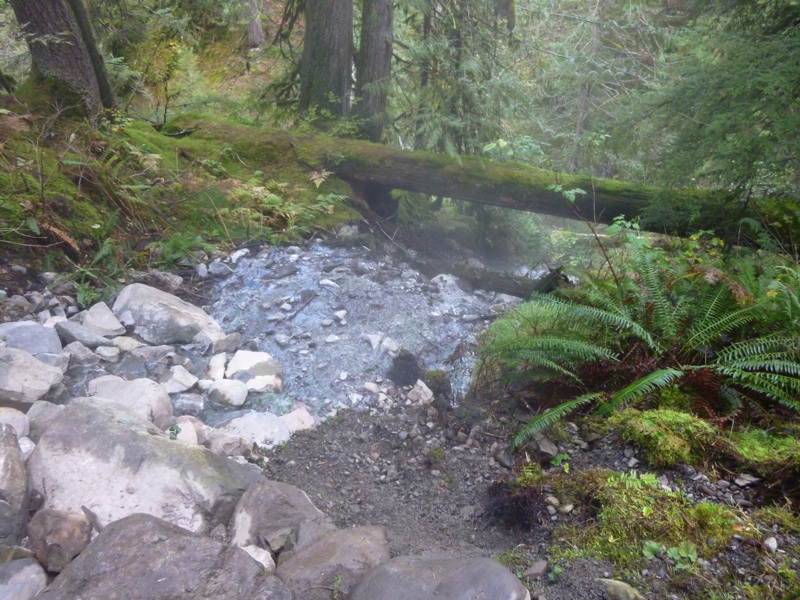 The trail itself was as pretty as ever. It was like something out of a fairy tale, with bubbling springs, dark glens and a host of mushrooms lining the side of the trail. The hot springs themselves were shrouded with mist, and the flowing mineral water had precipitated a bluish white glaze along the channels. The new bridge was a great log with sturdy handrails and offered a great view of the stream below. It's a wonderful walk, an hour each way from the parking lot to the springs, but be prepared. Anything might happen.