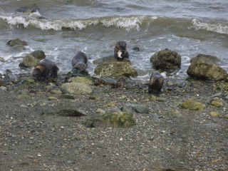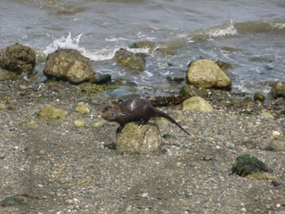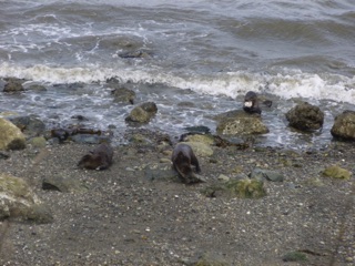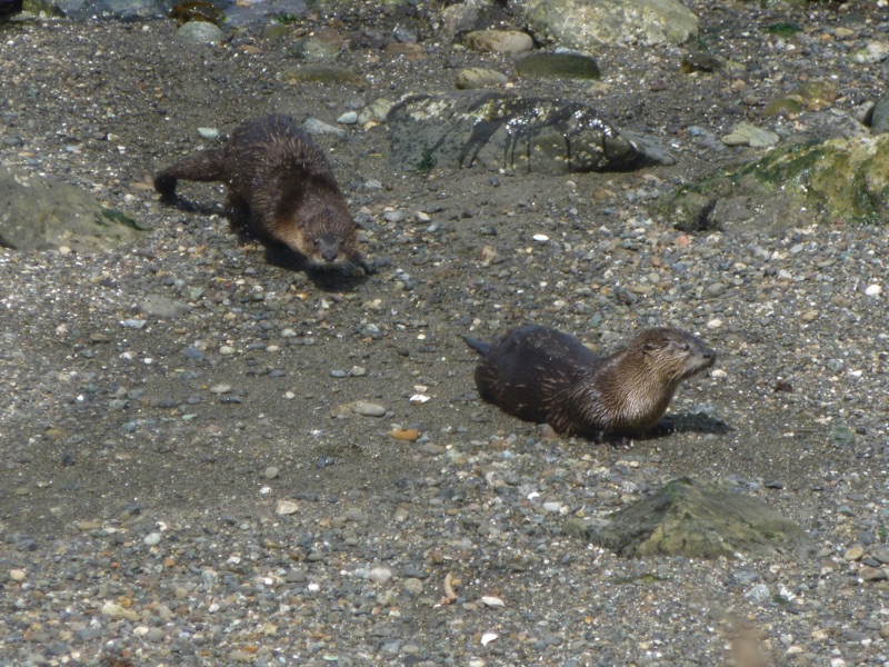 We first spotted these river otters while they were swimming in the Strait of San Juan de Fuca. We were a bit east of town, past the Rayonnier site, along the waterfront. One of them had a fish of some sort. They made their way to shore where they posed for a bit. Then they disappeared into the rocks below us.