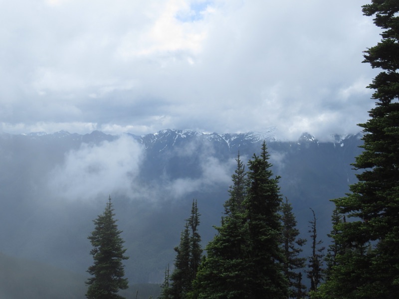 We took advantage of the cloudy weather to hike up to Hurricane Hill. The distant mountains at times were obscure and at others clear, so the view changed as we walked. Now and then a bright ray of sun would illuminate a field of snow on a mountain top, then the clouds would move and hide the entire range from us.