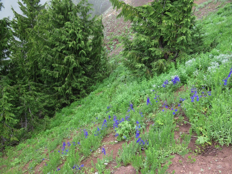 This has been a magnificent year for larkspur. It loves the rocky mountain soil, but this year seems to have been perfect for it. The wall flowers and phlox are passing, but there were roses blooming, dirty sock plant, paintbrush and a host of other flowers. After last year’s drought left the lupines shrunken, we feared the worst this year. There were lupines out, but it looks like it is still early in their season. The corn lilies on our favorite side spur have grown larger, but are not yet in bloom.