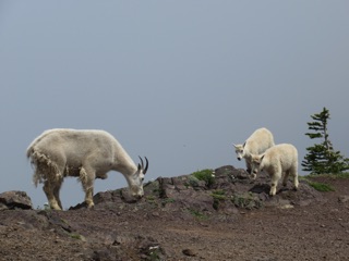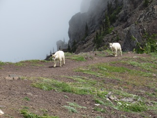 The sky had been cloudy, and more clouds were moving in as we approached the top. We could tell that there was no view to the north and the view to the south would be closed in soon. Luckily, a band of traveling players was on its way to provide for our entertainment. We were not the only ones on Klahane Ridge, for along with the other humans were at least a dozen mountain goats including a good number of kids.