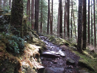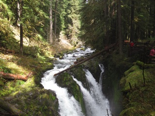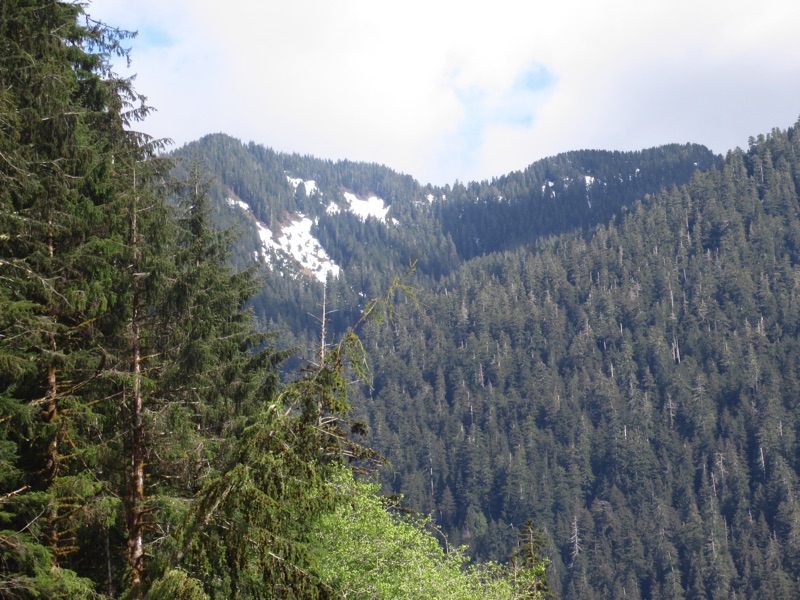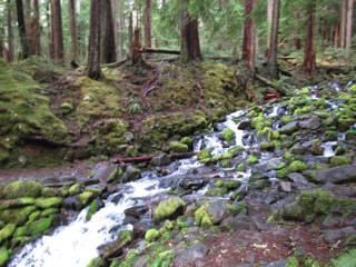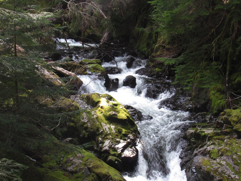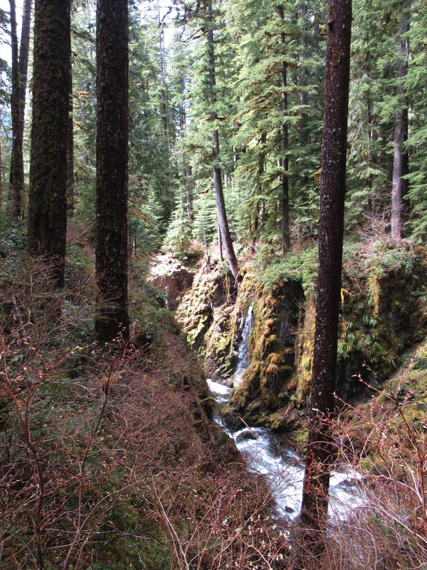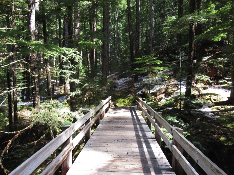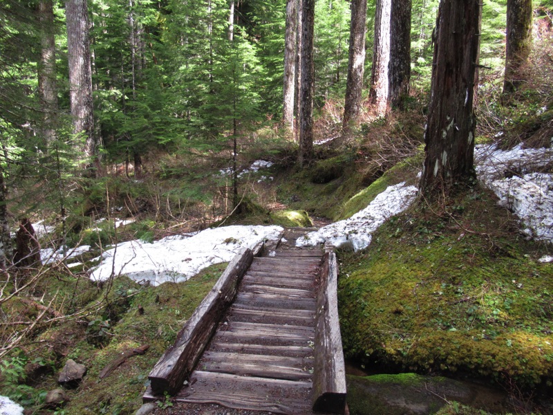 We headed up trail on the far side of the river, taking the trail to Deer Lake. The trail meanders for a ways with little streams and curtains of drips, then it follows Canyon Creek which flows down from the lake. We made it to the bridge, about 500 feet above the falls. By this point we had run into some patches of snow on and beside the trail. Looking upstream we could see more snow above, melting and feeding Canyon Creek.
