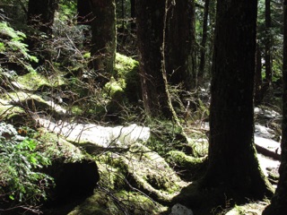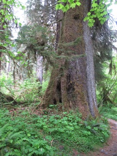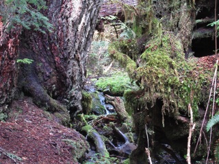 Some of the biggest trees are along the trail past the waterfall, but before Five Mile Island. The trail is mainly inland here, and there are streams to cross. Some have bridges, some have conveniently placed stones and some just have to be waded across. It's part of the forest adventure.