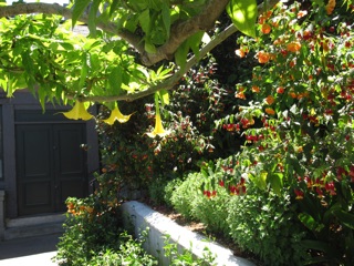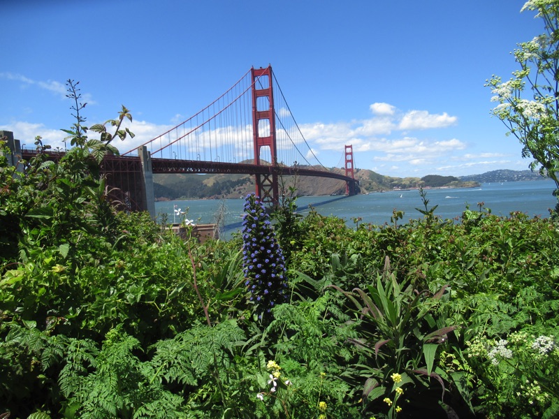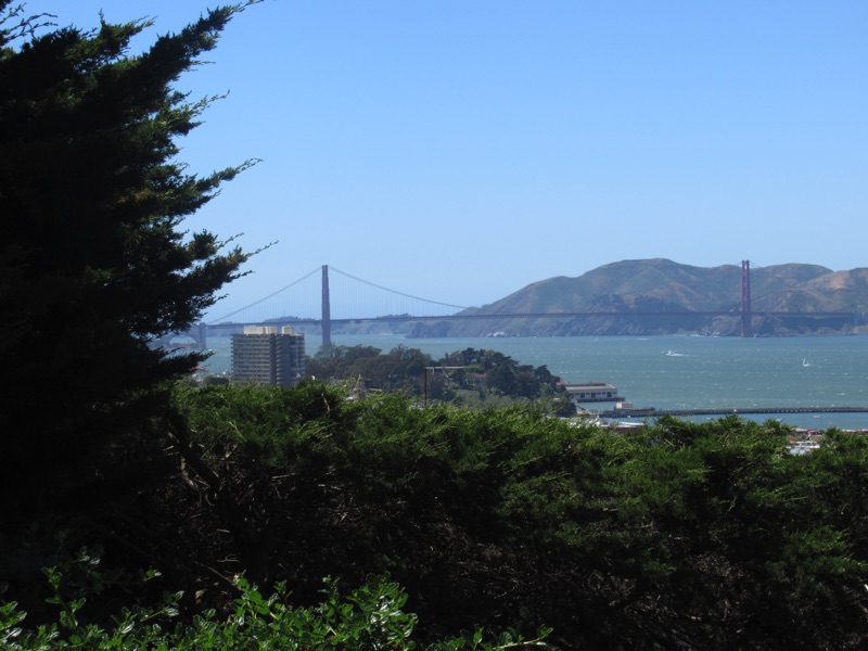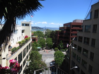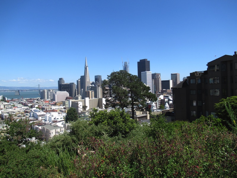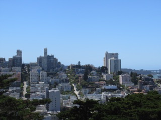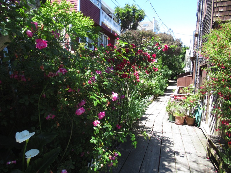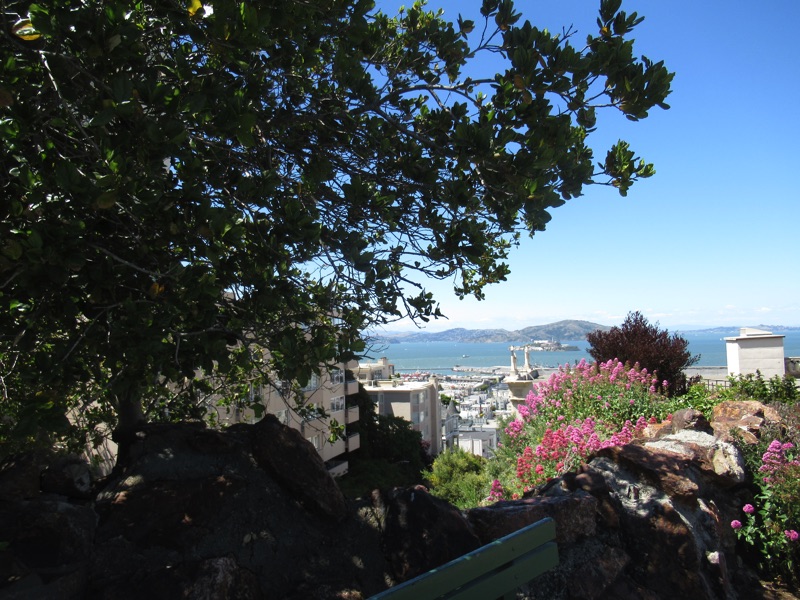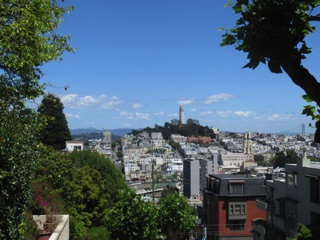 One of our favorite walks in San Francisco is the climb up the Filbert Street steps. It starts in an alley and heads up a rickety set of metal and concrete steps. It turns into a staircase through a garden which offers wonderful views of San Francisco Bay. There were roses in bloom and nasturtiums everywhere. The climb tops out at Coit Tower which offers even more views of the city and bay.