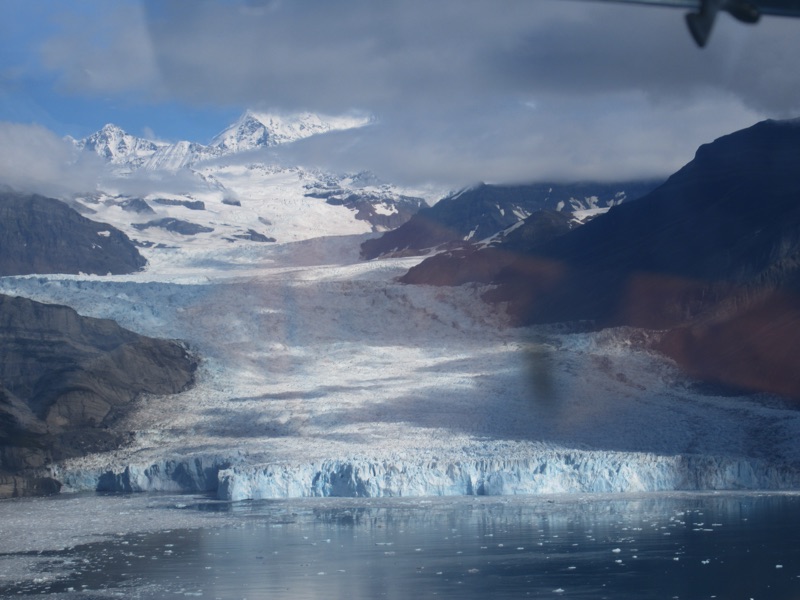 Then we flew along the coast for a bit before turning into one of the bays. Here, spread out before us was a magnificent glacier. Our pilot flew us high for a view of the bay. Our pilot flew us low for a view along the melting wall of ice as it met salt water. Then our pilot landed us on an impossibly small patch of land at the edge of the water.
