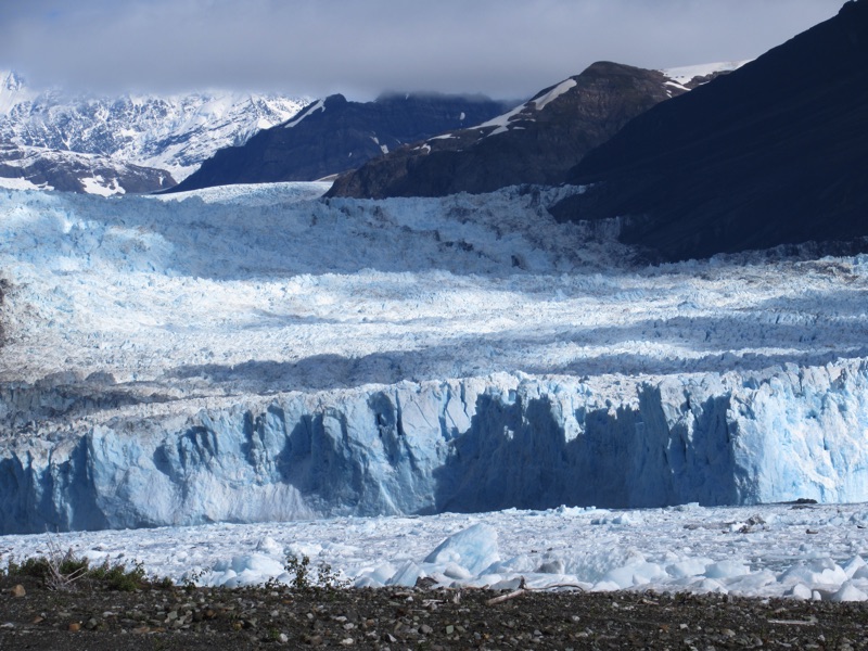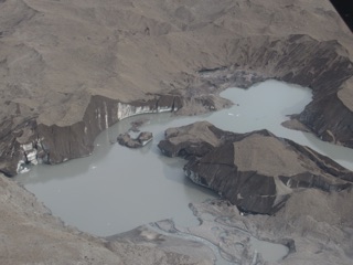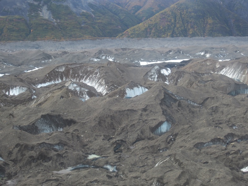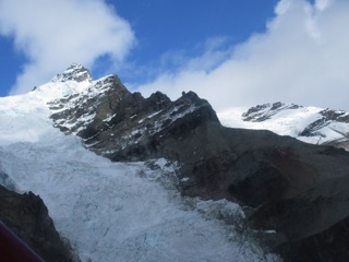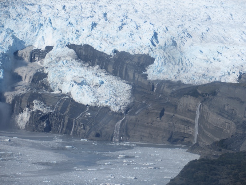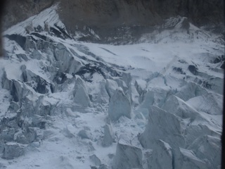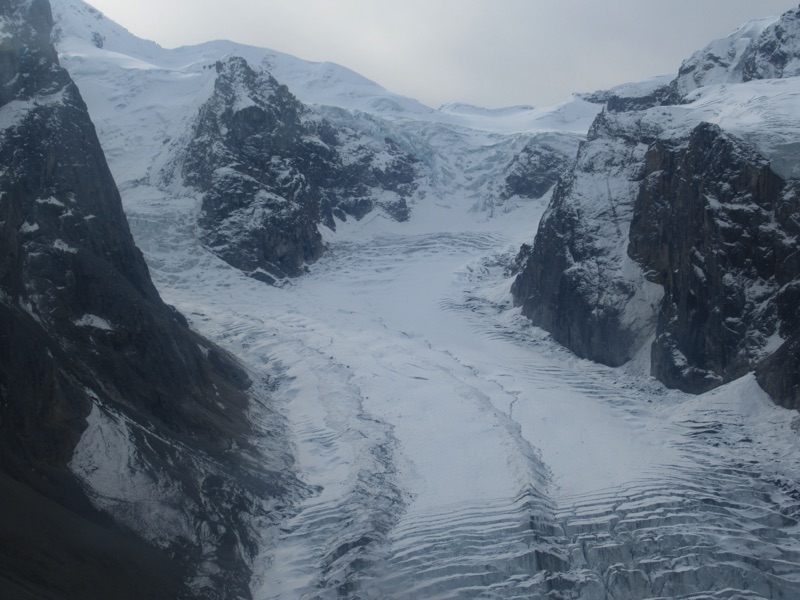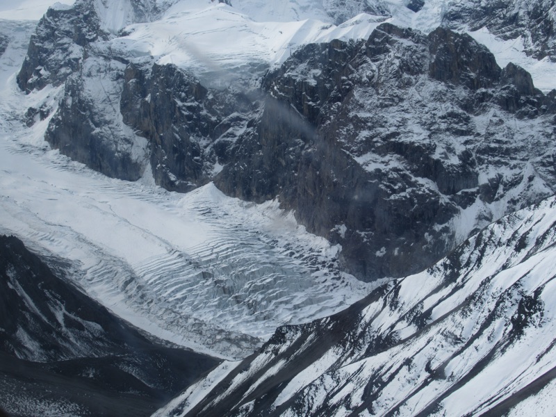 Our goodbye tour took us over one of the great glaciers and into the connecting canyons where other glaciers flowed down mountain sides to join it. There were a lot of glaciers and a lot of canyons, so our pilot took us about past steep rock walls and over the rivers of ice.