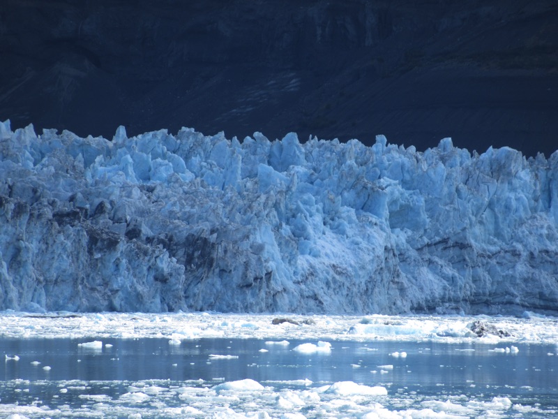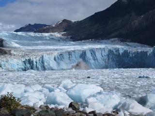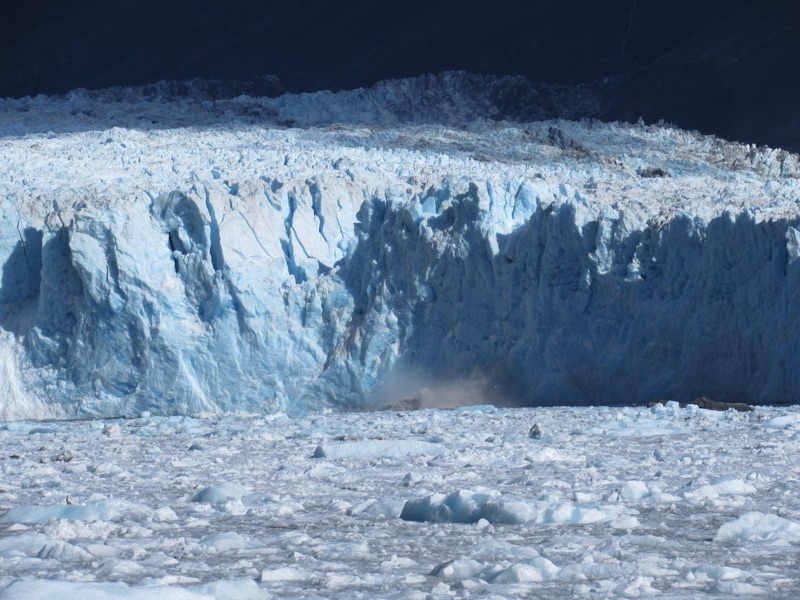 While we dined, the glacier entertained us as chunks of ice snapped and cracked and dropped into the sea leaving clouds of shattered ice in their wake. For a while, after a large piece of ice dropped, the sea where we were would stay calm, but after a while the sea would start to churn. The chunks of floating ice would rise and fall as the wave front moved past with an ominous rushing sound like an angry river.