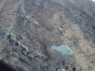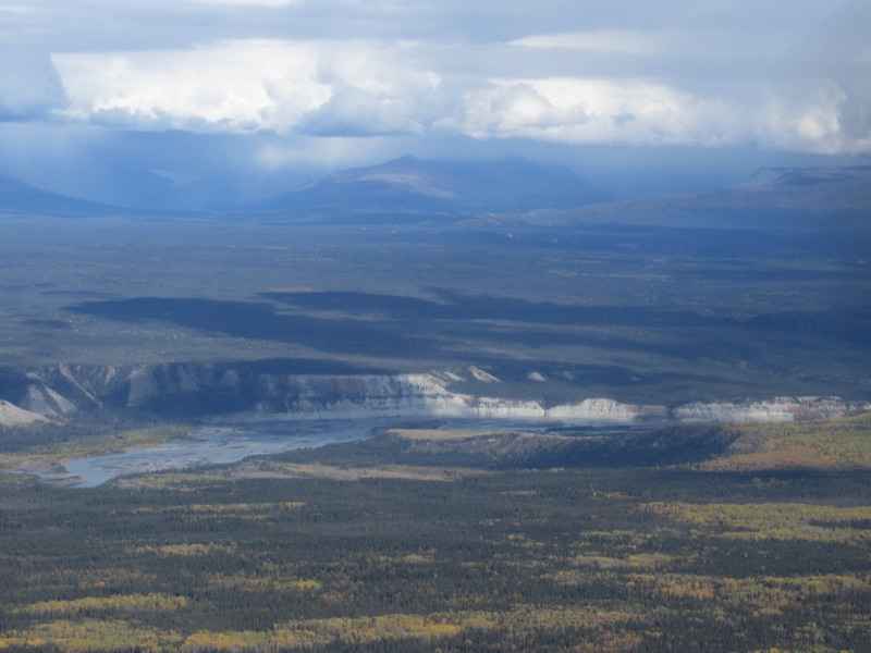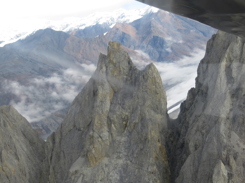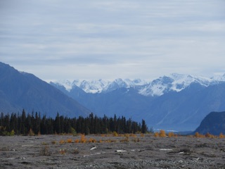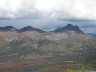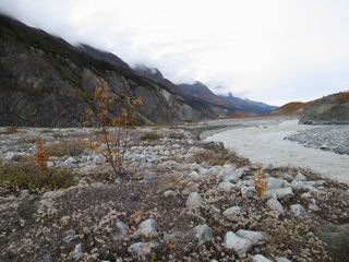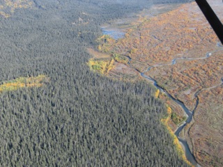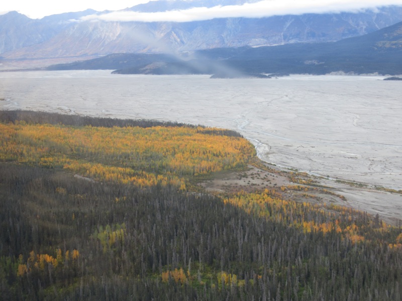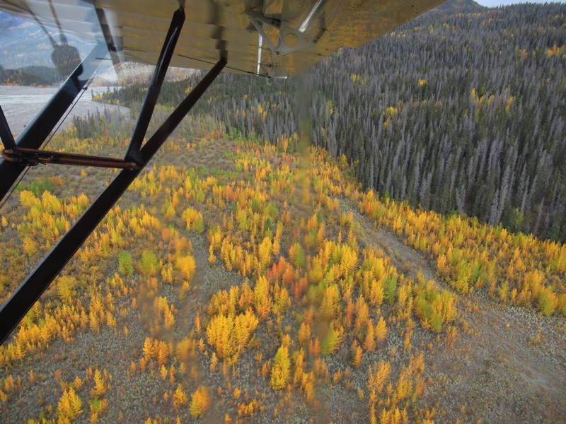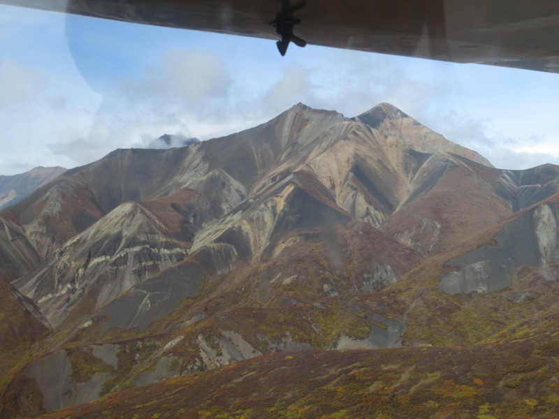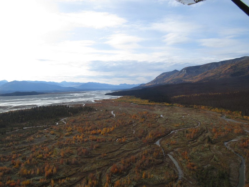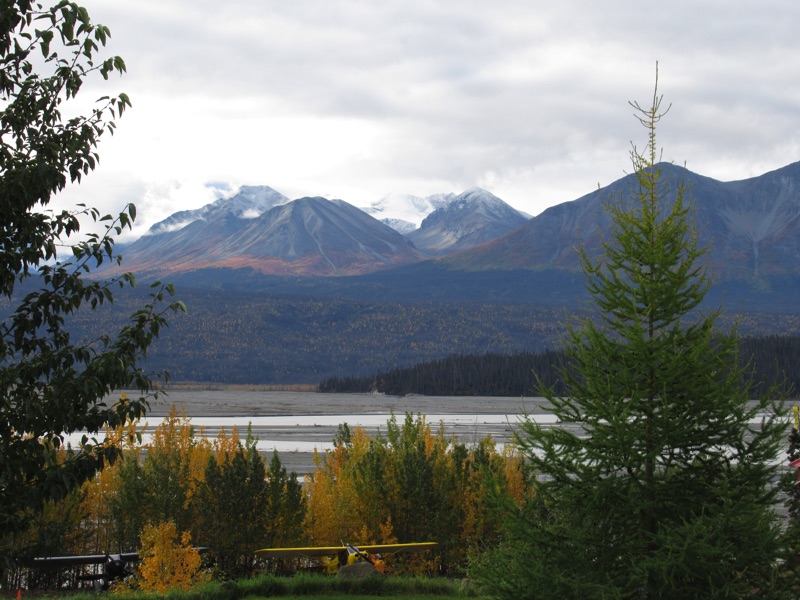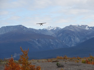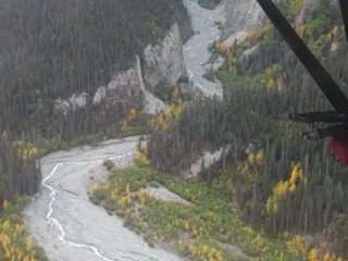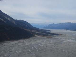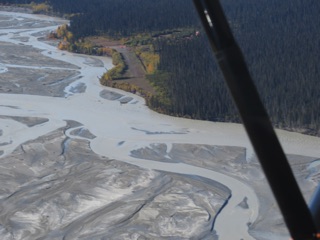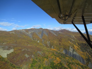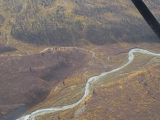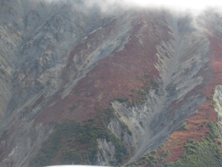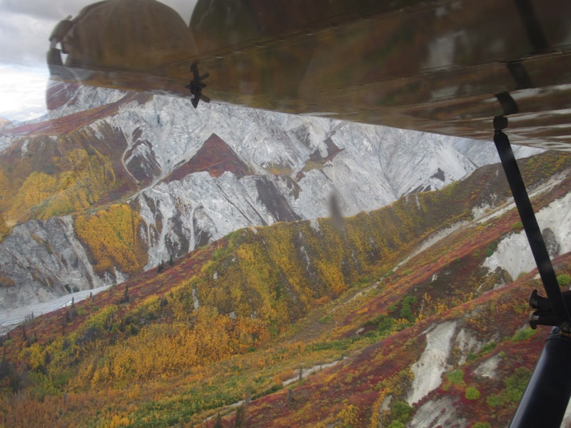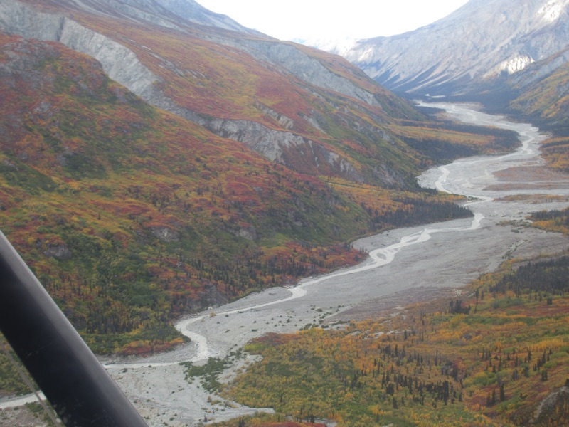 Our flight back was as amazing as our flight out. We headed north towards the lodge passing over mountains of ice and following the course of wild rivers. As we descended, the mountains were full of fall color. It's hard to capture from an airplane, especially the crowded back seat, but the effect was overwhelming.