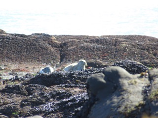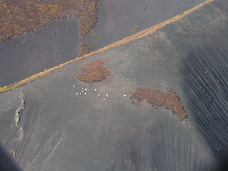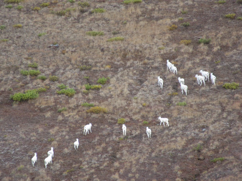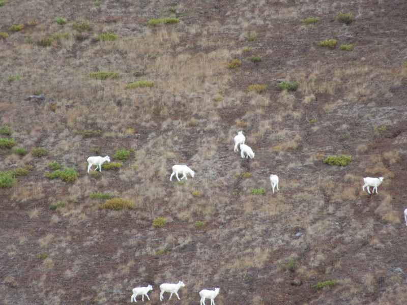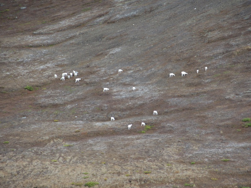 We could see the herd of Dall sheep from quite a distance, tiny white forms dotting the hills. Our binoculars revealed more detail, and as we approached we could see an entire herd of sheep all busy doing the usual sheep things, mainly eating. As we drew nearer, a bunch of them got skittish and bolted up the far hillside. Then they settled down and returned to their meal.