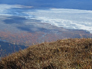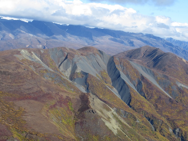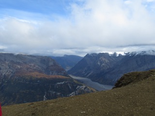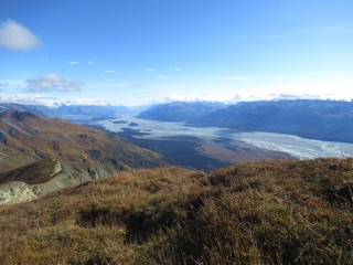 We loosely followed the ridge, now and then heading towards the edge towards fantastic views of the Chitina River. That name means "copper river". The "na" suffix means river and appears in a lot of Alaskan river names. The "chit" part refers to copper. This region was known from time immemorial for its copper ore, and one of the biggest copper mines in the world, the Kennecott mine, was in the area.