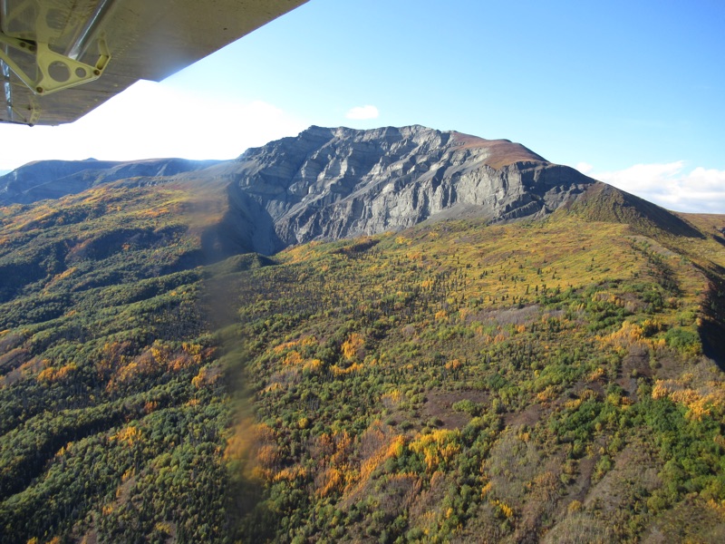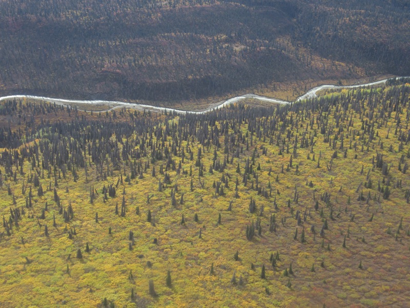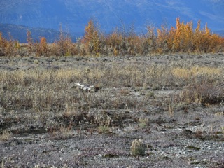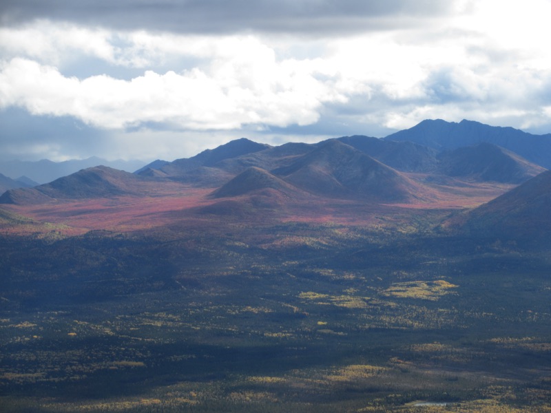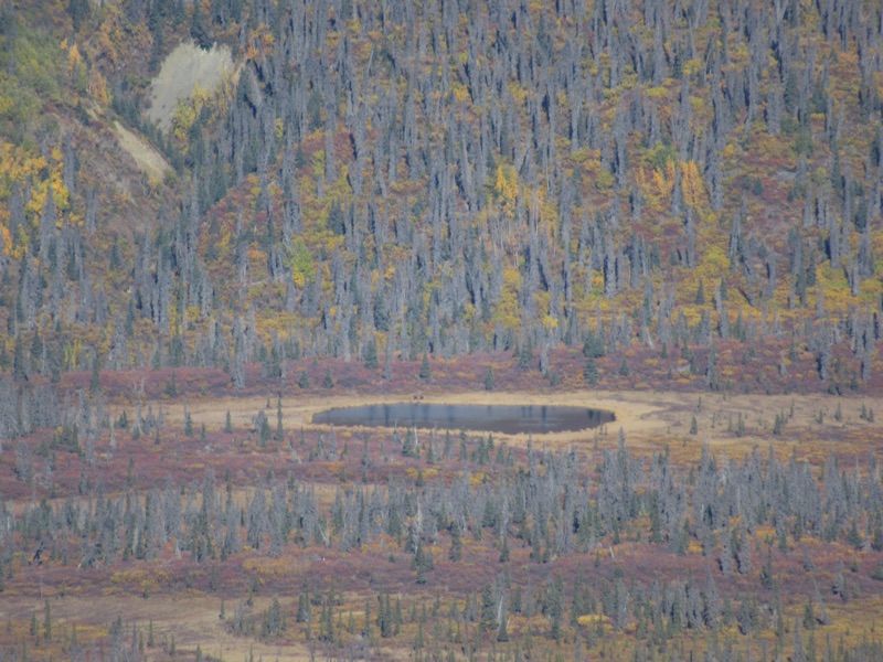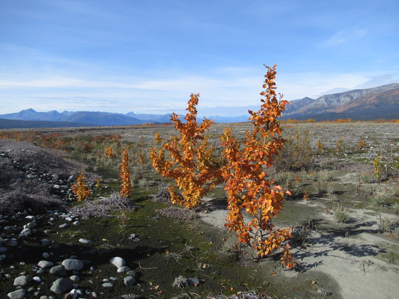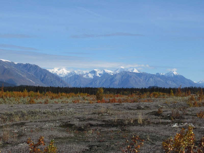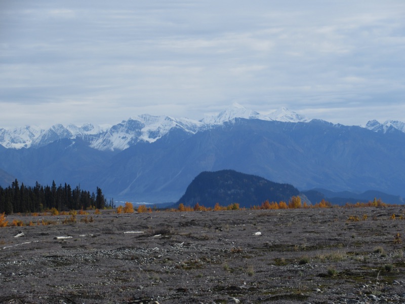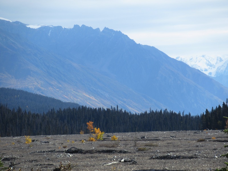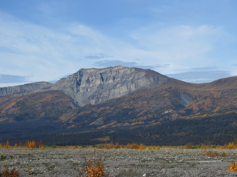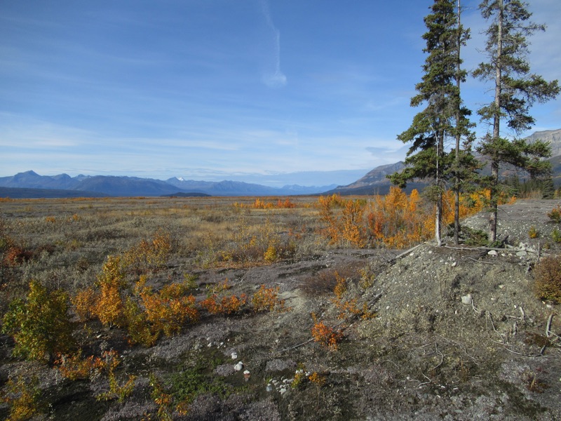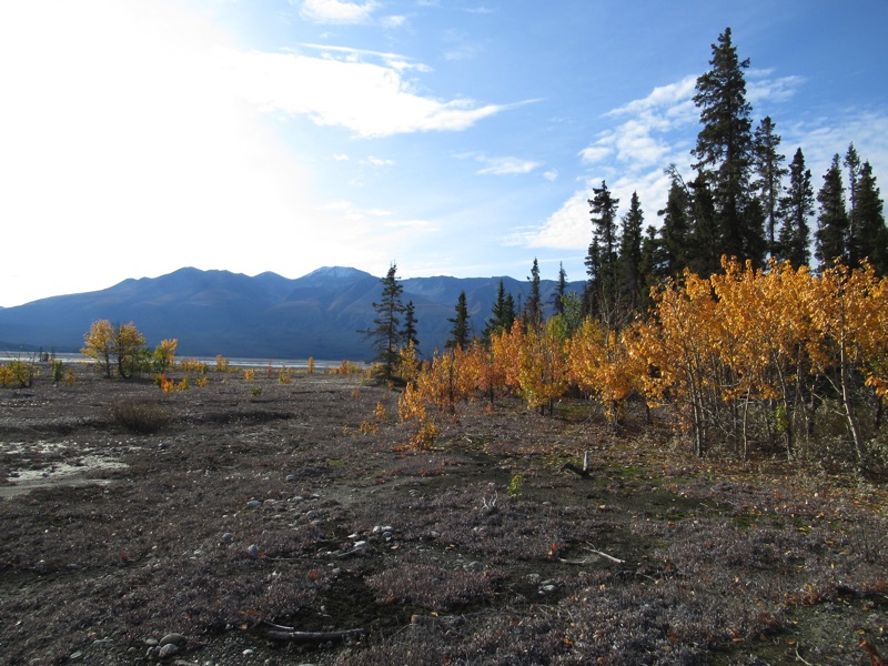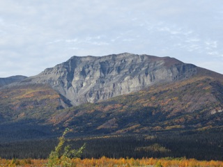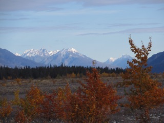We hadn't expected autumn foliage in Alaska. I suppose we imagined that the trees would go from green to barren in one single powerful blast of cold air coming off the slopes of the Brooks Range if not from the Arctic. We seem to have arrived at its peak. The forest were golden in contrast to the pale blue color scheme of the distant mountains.