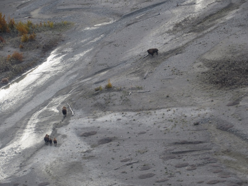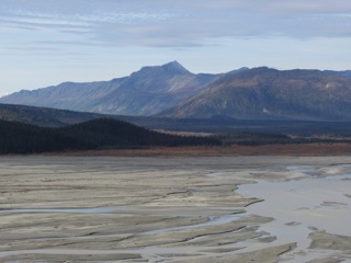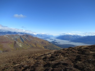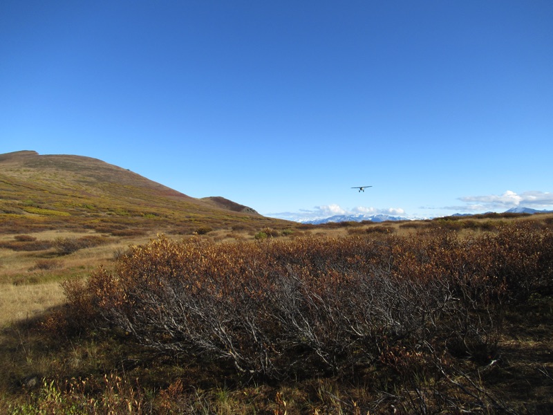 Our second day was a hiking adventure. We took a short flight to the ridge that followed the river. It was just north of the lodge and offered views of the Chitina River and distant mountains. It was three thousand and some feet higher than the valley floor, so we circled for a bit before heading north. We set down on yet another impossibly short landing strip where our guide was waiting for us with supplies and a high powered rifle, just in case.