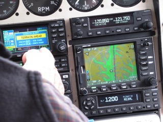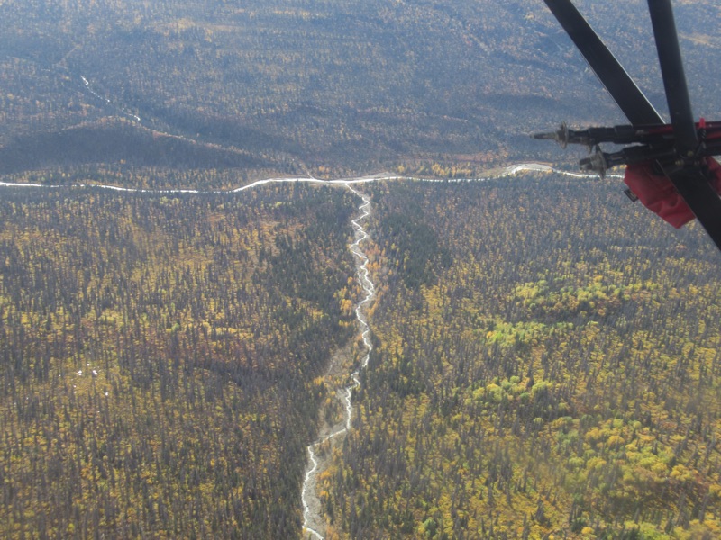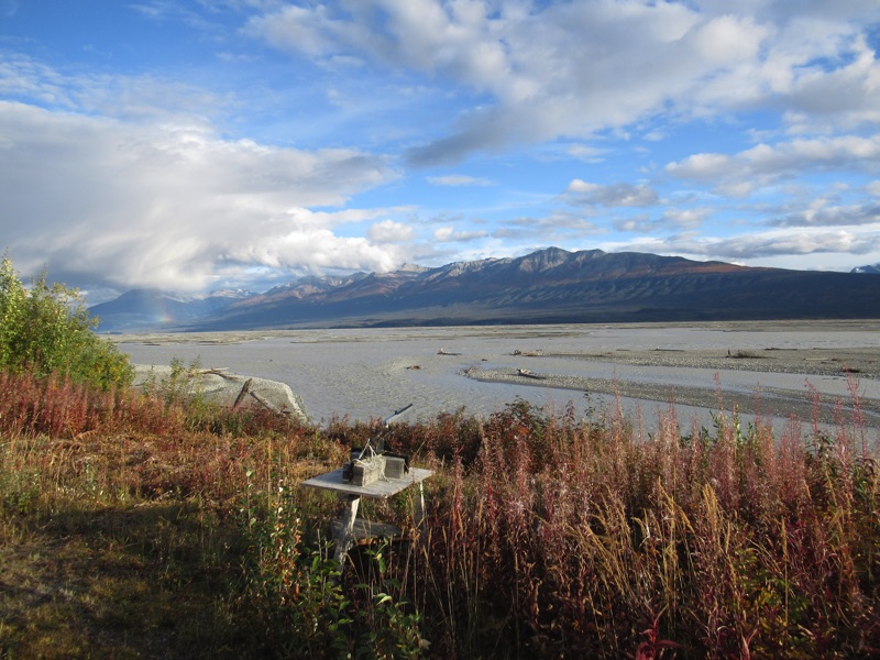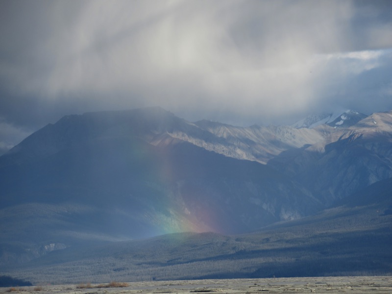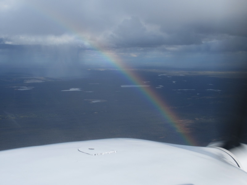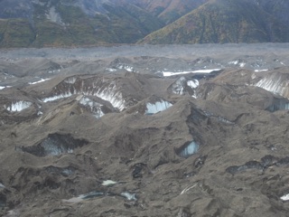 We took off, said goodbye to Anchorage, and were soon looking out the windows as the landscape rolled and folded dramatically. As the instruments on board showed, there was terrain ahead, lots of terrain. There was also ice, vast glaciers of ice, and rivers run wild between the mountains. We caught a bit of fall color and a rainbow, but we kept flying east.