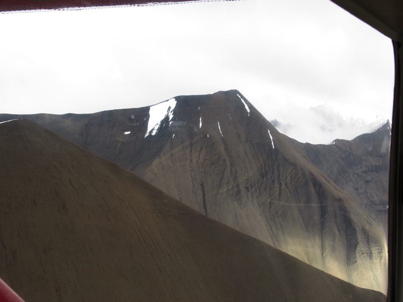We had one more stop before McCarthy. We had flown far through the hills. Our pilot circled, testing the winds. Then we landed on a high ridge. It was wide open. We were scared to get too close to the edge. For some reason, flying what seemed inches from a mountainside thousands of feet above an active glacier wasn't a problem, but walking across a meadow towards the edge of a cliff turned our legs to jelly. Go figure. Then again, our pilots seemed to be more competent in the air than we are on the ground.