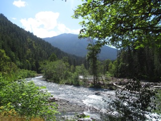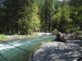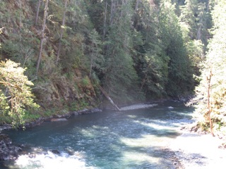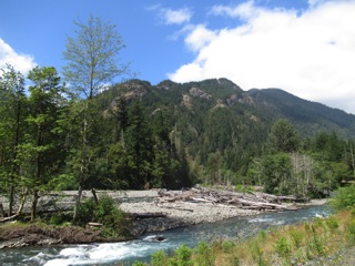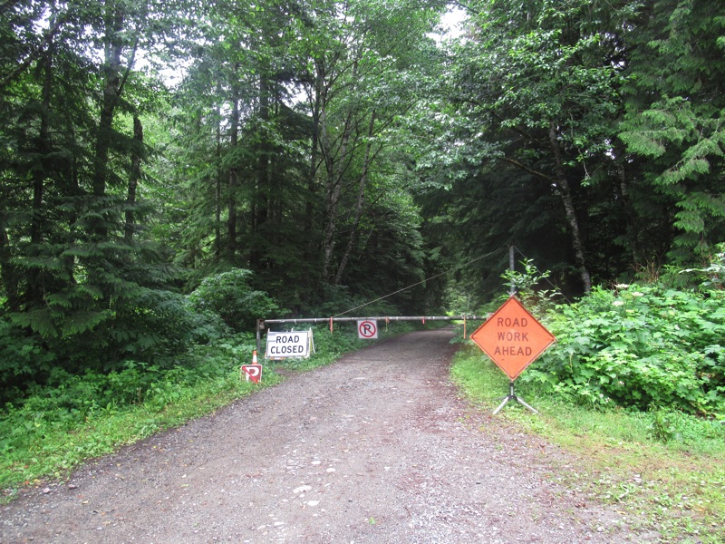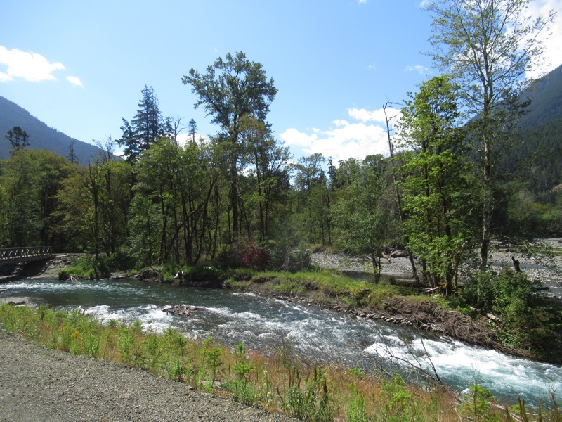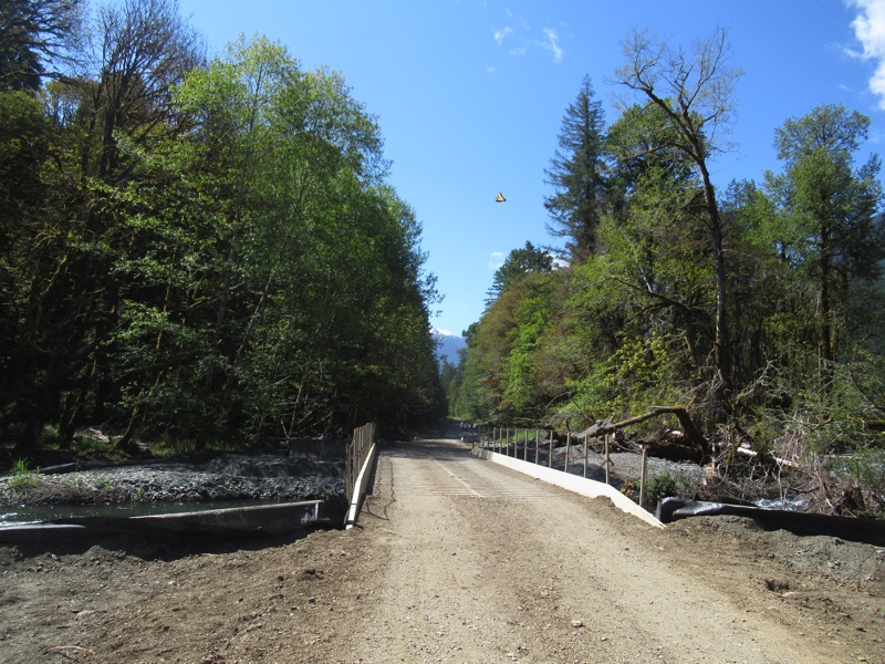 We made our way to the next new tributary of the Elwha, where the river had carved a pair of passages across the roadway. There were now a pair of bridges in place. We continued on and were soon at the ranger station and construction facility across the way. We continued past the turn off for Whiskey Bend Road and on to the bridge right before the old Altair campground.