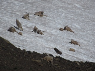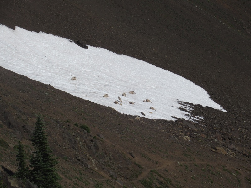 On our way back, someone mentioned seeing mountain goats. We had missed them. As we neared the ridge junction, there was a patch of snow in the bowl to the north. There they were, an entire herd of goats. We had noticed the patch of snow and what appeared to be rough patches where the snow had piled up. Those were the goats! This time we paid attention, and there they were.
