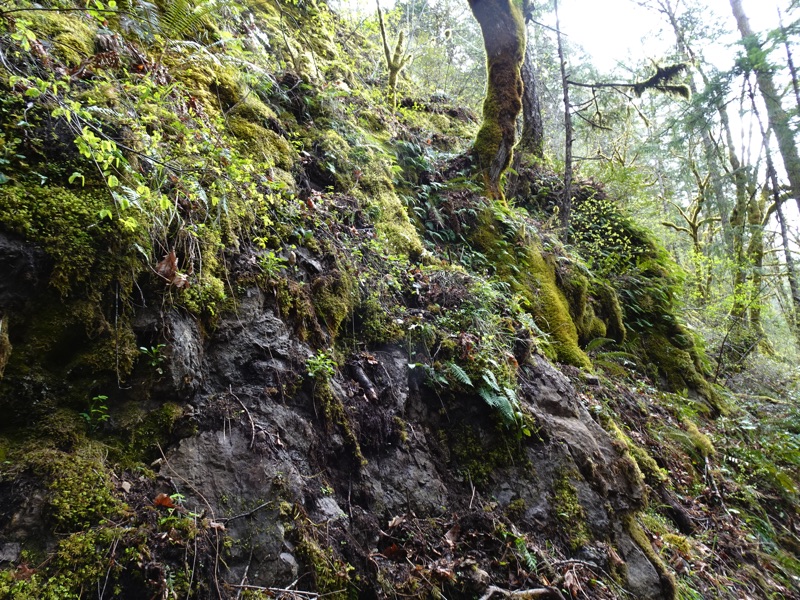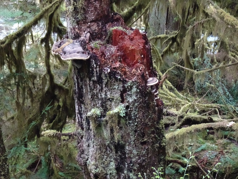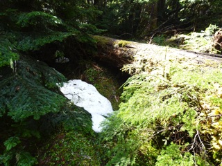 The detour trail heads up past a work area at the end of the service road and then heads higher to a junction with the Cascade Rock trail. There are glimpses of the Elwha along the way as it follows the ridge past the washout. After the junction the trail goes down a bit, then up a bit, then slowly descends behind the old campground. There is a sturdy tributary of the Elwha running between the trail and the collapsed campground pavilion.