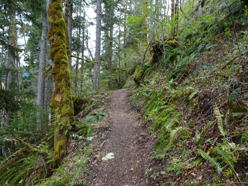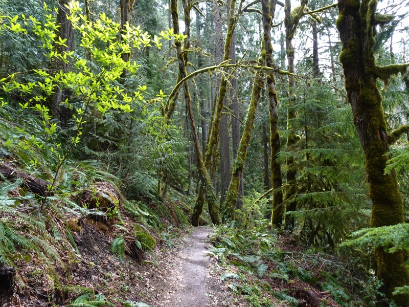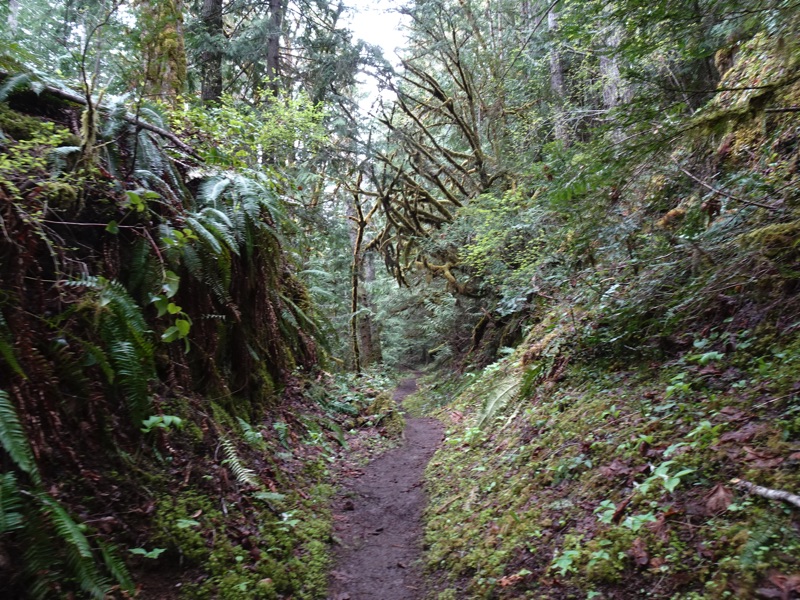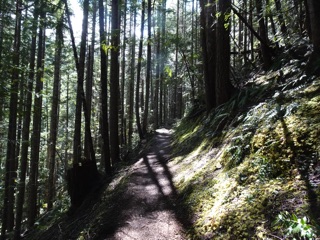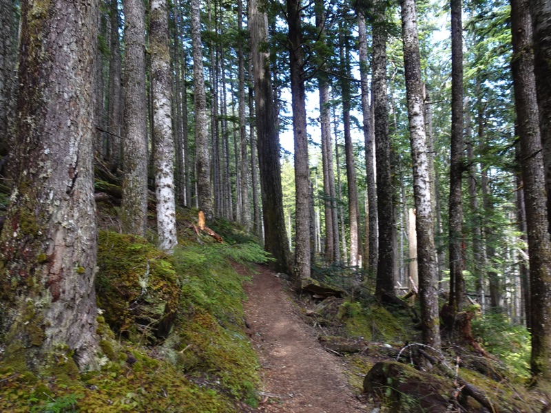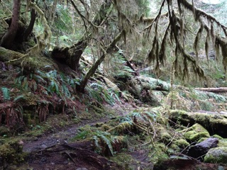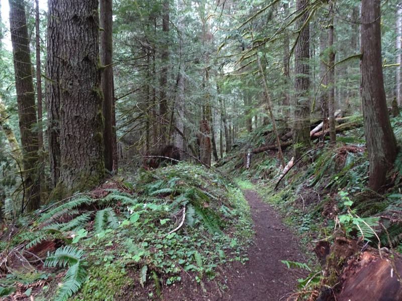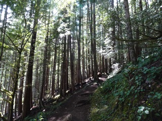 The trail starts with a descent to a bridge over the river, but for a fair way it is just gentle up and down and pretty easy going. There are ferns and salal and, here and there, some rather large trees. The trail follows the river, and eventually runs along it. We even stopped to soak our feet for a bit. The water was icy.