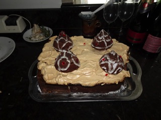 We held our Russian Easter party again. That meant pelmeni, home made sausage, grilled lamb loin, smoked salmon and blini with salmon roe and butter and more butter. There was also champagne and the Defense of Moscow. Once again, the Monster Napoleon was on the march, and once again Moscow was defended by fire, ironically ignited by means of French brandy. It was an excellent defense, so there was lots of Moscow / baked Alaska left for all present.