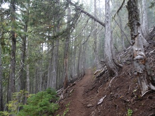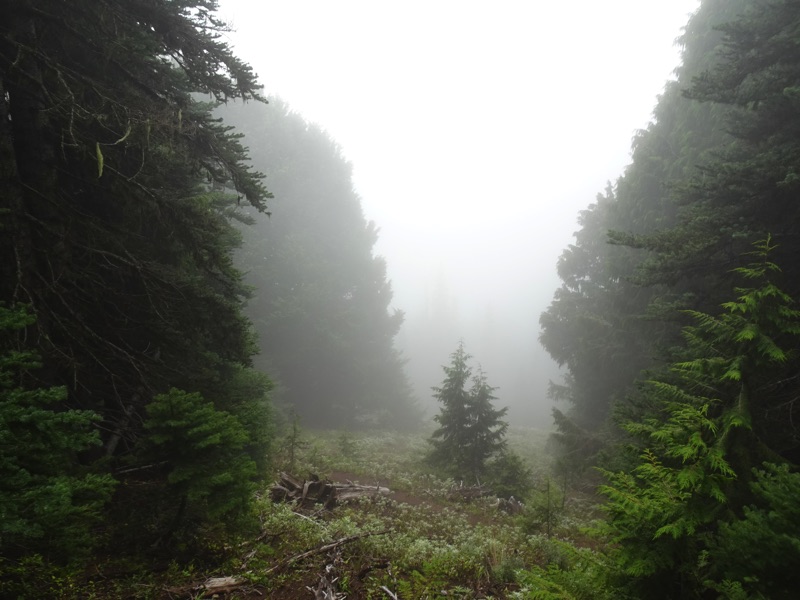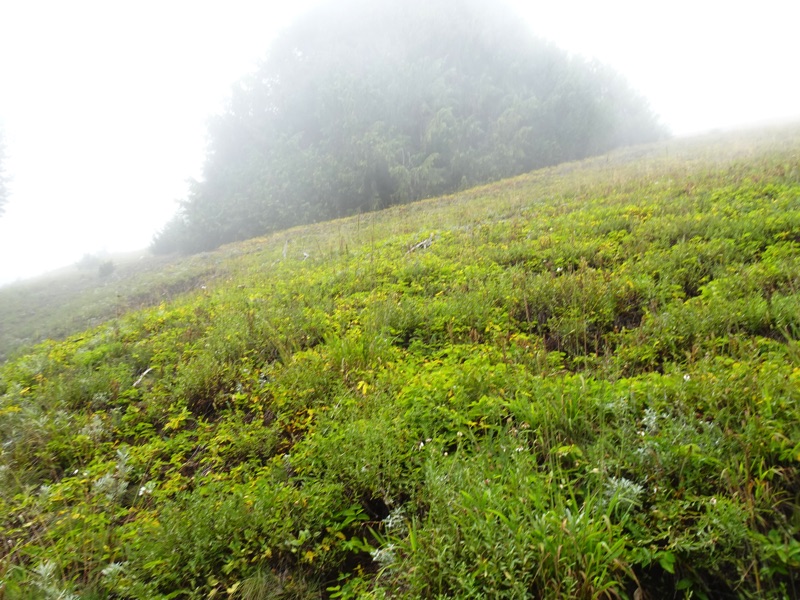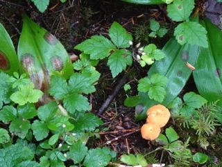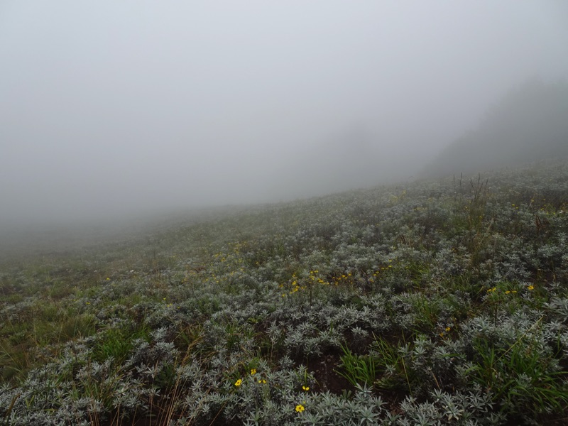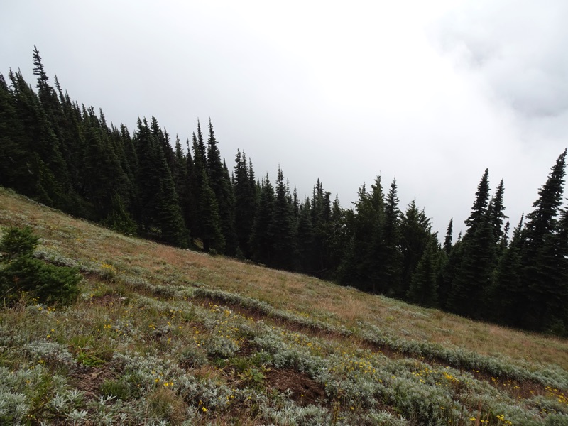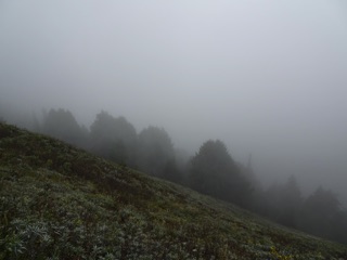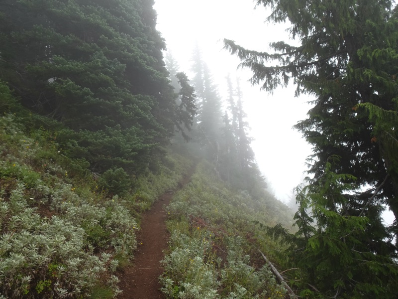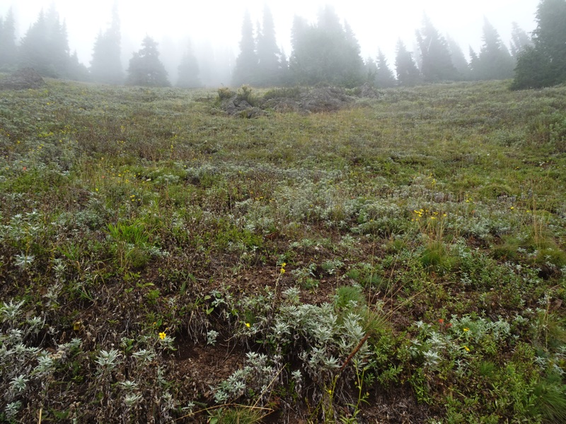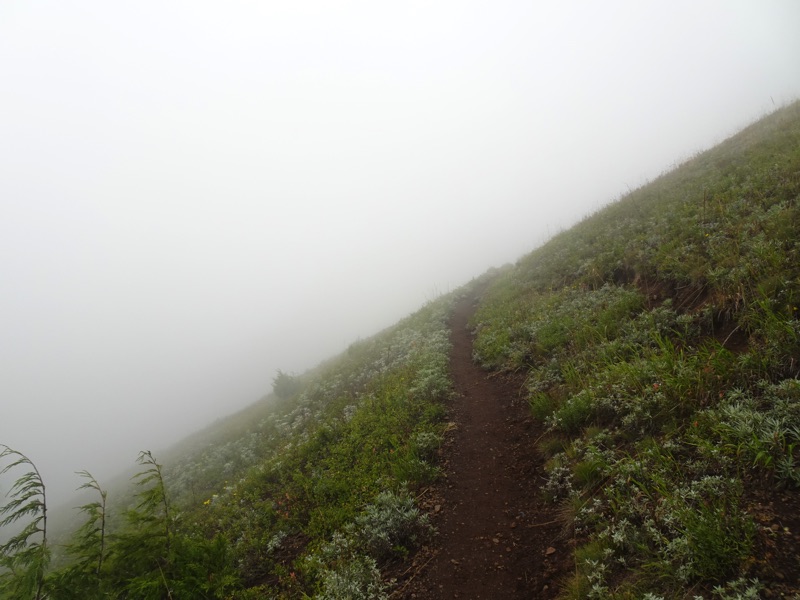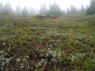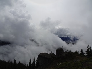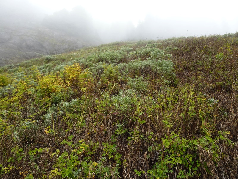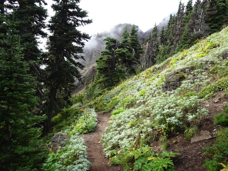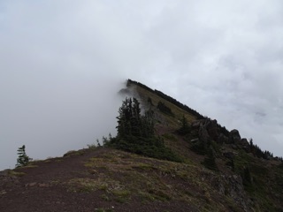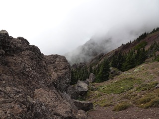 It's already autumn up on Klahane Ridge. We drove into to the clouds after a fresh rain. The trail closes next week so they can rebuild the road, so we went on the first relatively dry day. The trail was wet. There were sparkling drops of water glistening on the lupine leaves. The clouds curled about the ridge. Visibility varied and the sun brightened and dimmed setting off the colors of the late summer, early fall foliage. There were no views of the distant Olympics. Not even Sunrise Point was visible. Still, the views were spectacular in their own way.