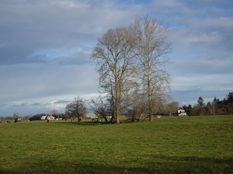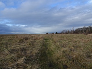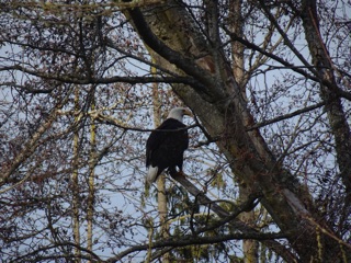 We saw a number of eagles along our walk on the Dungeness Dike. It's a good relaxing hike on a nice soft, flat surface. Then we crossed the Dungeness River heading west on Anderson Road and took a short walk north towards the Strait of San Juan de Fuca. It was a broad flat marshy field with a trail that seemed to lead all the way to the strait, but we didn't get that far. We'll have to come back and explore some more.