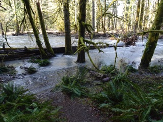 We took advantage of a relatively sunny day to head up along the Elwha, starting at Madison Falls and past the Altair Bridge. The Elwha was the big attraction. With the recent rains, it was in full flood. We took the detour, climbing up past the water tank. As we approached the river, we could see it had overflowed its banks. Trees were standing in rushing water. A part of the trail was flooded, so we took the little wooden foot bridge for a dry passage.