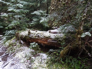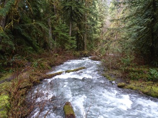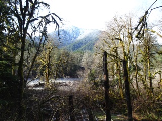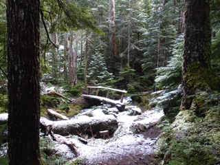 We took a short walk up the Lake Angeles Trail, as far as the little bridge about 730' above the trailhead. The parking lot is smaller than it used to be, but very few people were out on the trail that day. The trailhead is about 1900' above sea level, and the trail was snow free until we neared the little bridge where there was an icy dusting. The stream under the bridge was flowing briskly. There was a coating of ice and snow on the bridge itself, so we didn't cross. We were pleased to have climbed as far as we had.