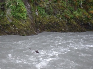 The river itself was in full flow with white water rushing along, over logs and rocks and around all obstacles. Meanwhile, the cliffs were dripping wet and covered with green. Every side stream and little waterfall feeding the river was running flat out. This is what temperate rain forest should be, at least during the rainy season.