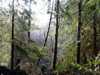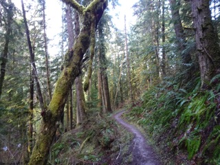 The Little River Trail starts in DNR land near the junction of Black Diamond and Little River Roads. The trailhead is at about 1000' above sea level, so it is well below the snow line. That made for easy but muddy walking. We descended and crossed the Little River and passed through the DNR land with its second growth forest. Then, we entered the park and descended again to the river and old growth. We made it across the two wood bridges over the river to get around a landslide, but we didn't head much farther. It was cold, and we were getting muddy, wet and tired.