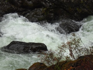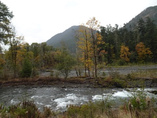 We took a short walk along the Elwha River starting at Madison Falls where the road ends. The mountains were misty and topped with early season snow. The autumn foliage was near its peak. We walked past the mule camp and around the bend for some good views of the river recently nourished by the seasonal rain. We stopped at the gap in the road cut by a hearty new Elwha tributary.