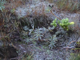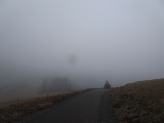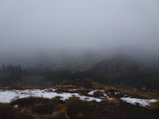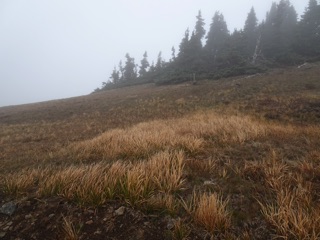 We were up at Hurricane Hill again to check for signs of winter. There were clouds in the mountains and the hills were shrouded with mist. The next post down is just pictures of the fall color and the gray, but here are some photos showing signs of winter.