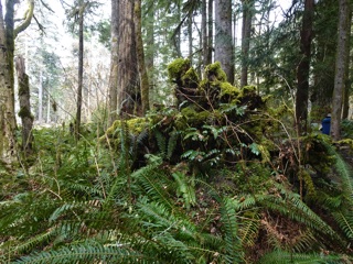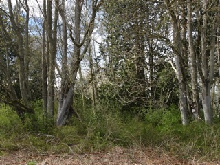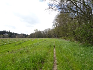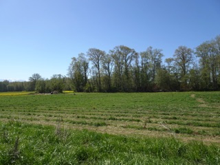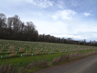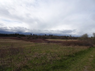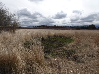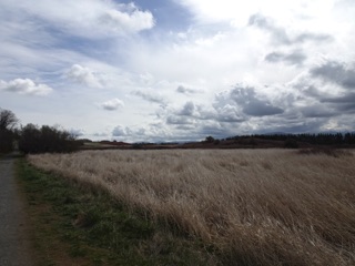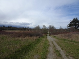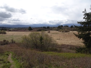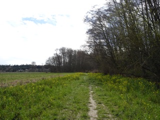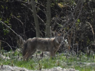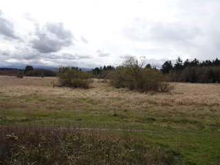We've been walking the new Dungeness Dike. The fields west of the new dike will someday be forest. We saw a variety of workers including a group from the Washington Conservation Corps hard at work mulching the hundreds of saplings. We've also been watching for signs of spring. Things have been getting greener and the yellow mustard is in bloom. On our way back, we saw a coyote. He was minding his own business, but he decided to watch us from a bit further away. We're a predator species too.