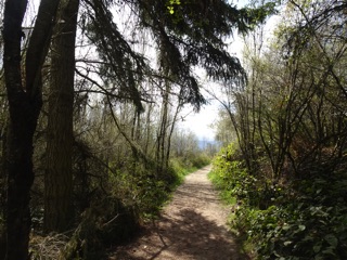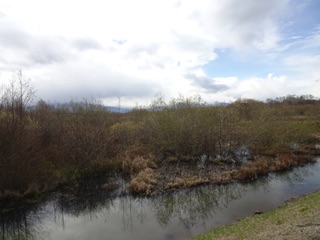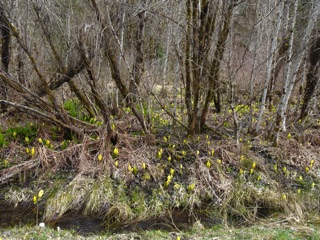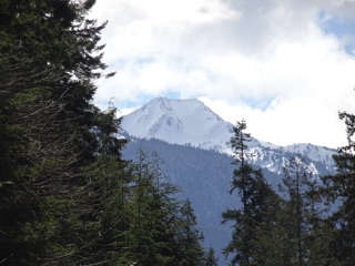 Further down the trail, we saw the skunk cabbage with its faint smell of sulphur. We checked out the river from the Altair Bridge. It was relatively low. The snows have not yet begun to melt. We could see snow on the peaks, some of it fresh.