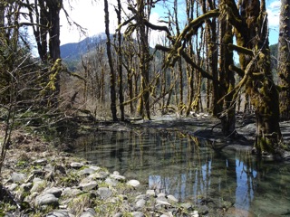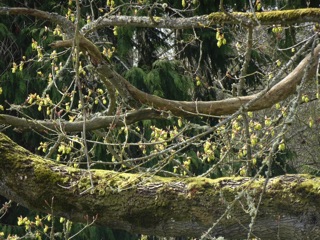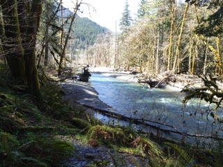 Our search for signs of spring took us to the Elwha River. We parked near Madison Falls and followed the road past the mule camp where we saw our first sign of spring: the mules were back. That was promising. We headed onto the detour trail and saw our first yellow violets of the season along with some of those pale pink flowers that bloom so early. Then we saw our first trillium. It was the only one we saw, but we're pretty sure more will follow.