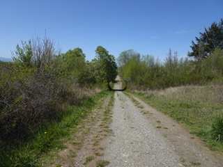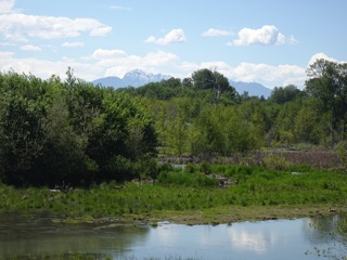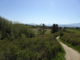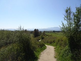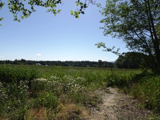 We sometimes just take a short walk at the Dungeness Dike. Sometimes we make the full 90 minute loop from the school house parking lot to the south end of the trail. That lets us leave the dike and head down on a trail that follows the path of the old dike. This late in the spring, it's tall grass and green. We even took a short side spur to take a look at the river.