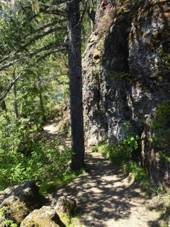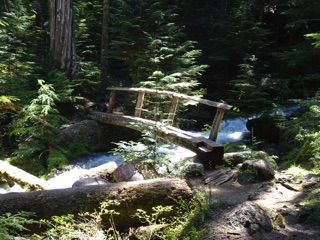 So, we made our way over the second bridge with its peculiar turn where one changes from the low log to the high log. Then we went on. The trail climbed so we had great views of the river below. There were trilliums and a great bank of fawn lilies. (We had been calling them columbines, but it turns out we had guessed wrong. What we had been calling shooting stars were actually columbines. This is what happens when one is enjoying the beauty of the trail and not fighting with a flower identification app.)