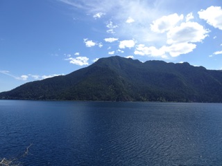 We hiked a bit of the Spruce Railroad Trail. It was a bright sunny day, but it is late enough into spring for the trees to have leafed out and provide a canopy. The sky was blue. The lake was blue. The forest was green. We were pleased to spot a few trilliums and enjoy the views of the lake and mountains.