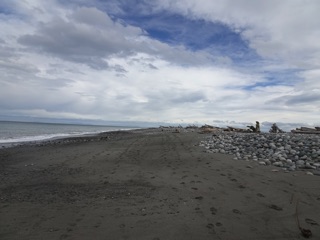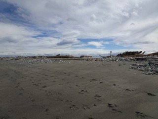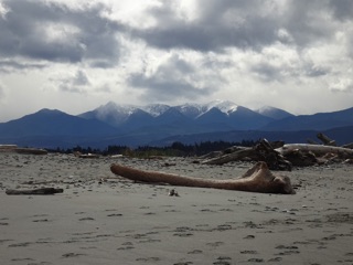 The spit itself was wide at low tide. There was less driftwood than some years, and most of the walking was on wet sand with some rocky areas here and there. We walked about about a mile and a half, all the while enjoying the ocean view on this magical spit of sand that juts out into the strait. We could see the mountains and clouds behind us as we headed out.