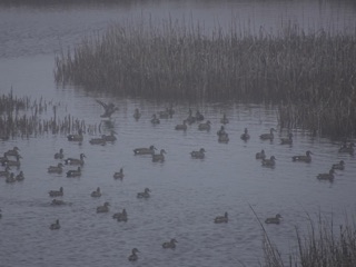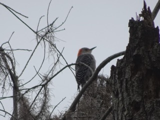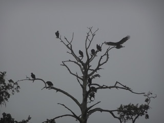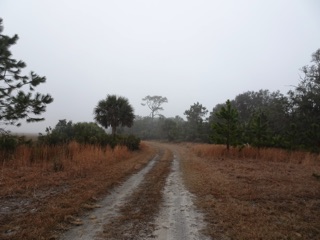 It was a wonderful misty day, and our walk began with a treat. There were wood storks in the pond but also a flock of roseate spoonbills. It was a great day for a hike with gray skies and mists. It can be easier to spot birds and wildlife when the sky is gray. If nothing else, there is less glare.