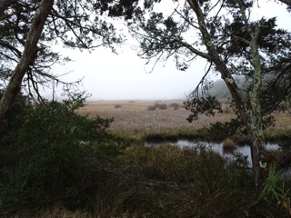 We were tired from our morning walk, but we just had to get out and do something, so we walked from the lodge to Three Pines and back. We had taken this walk just the day before, but that had been a sunny day. Today, there was mist shrouding everytbing.
