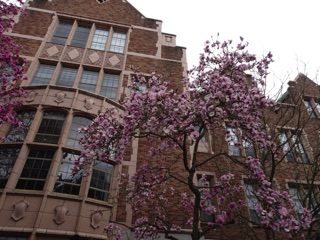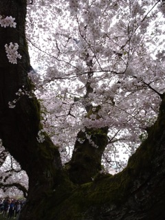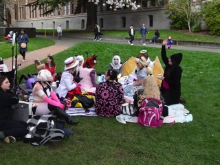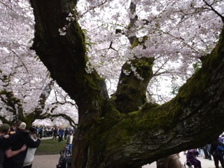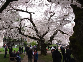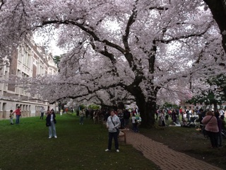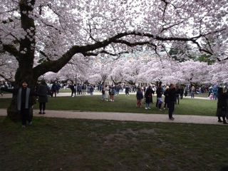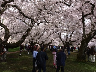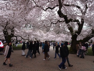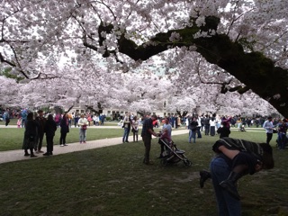 We made a quick trip into Seattle to check out the cherry blossoms at the quad at the University of Washington. It was a beautiful day, and the quad was full of people admiring the full bloom. There were lots of families with children, picnics, dancers and people in their Sunday best. You could tell that a lot of people were eager for spring. There was even a group of cosplayers, angels and devils, having a tea party complete with an etagere full of cupcakes.