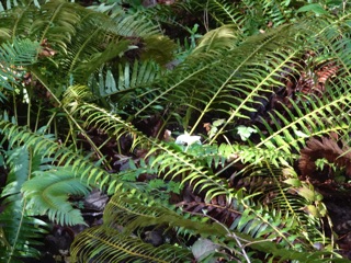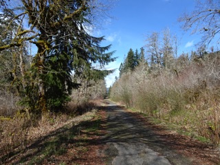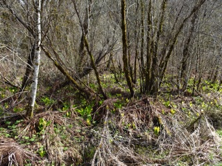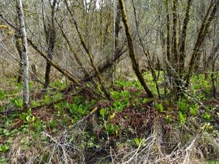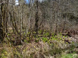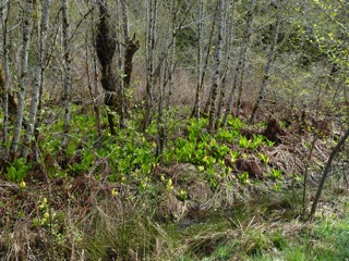 We were well rewarded. Our goal was skunk cabbage, and there was lots of skunk cabbage, especially past the ranger station as we approached the bridge. It grows in the drainage ditches and flooded areas of forest.