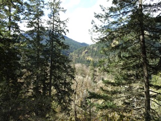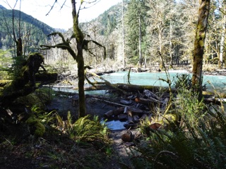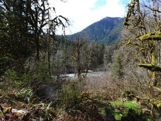 Now that spring is here, we've been hiking from Madison Falls up along the Elwha to the Altair Bridge. Most of the route follows Olympic Hot Springs Road, but the road is cut off by the river not far from the trailhead, so we take the detour through the hills around the old, now flooded, campground.