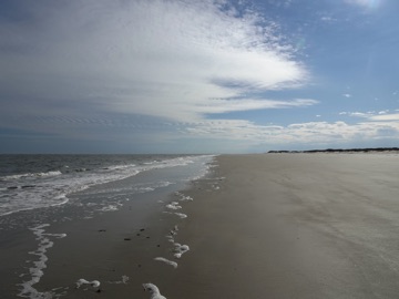 We took a walk along the beach looking for birds and sea life. There were some sand dollars, some peeps and some pelicans flying. There were also a few machines moving around sand at low tide.