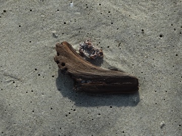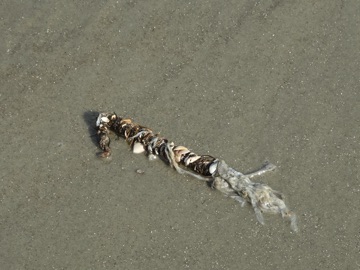 Here is some of the stuff we found on the beach. There was driftwood, and there were jellyfish, sand dollars and a number of interesting shells. There was also a lot of sand which is more interesting than it sounds.